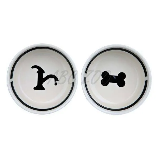 Železný stojan s dvoma odnímateľnými keramickými miskami s nápismi a obrázkami s priemerom 20 cm.