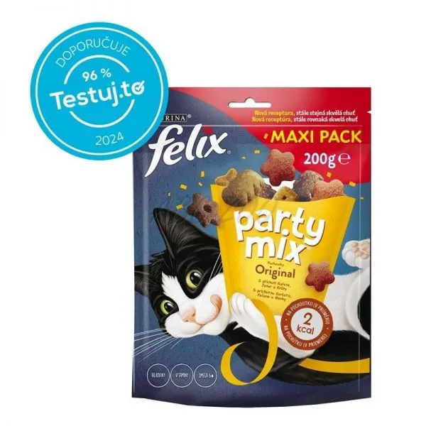 Doplnkové krmivo pre dospelé mačky Felix Party Mix Original vo forme chutných pochúťok.