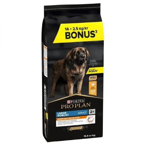 Purina PRO PLAN ADULT Large Robust je kompletné krmivo s vysokým podielom kuracieho mäsa a ryže určené pre dospelých psov veľkých robustných plemien (hmotnosť v dospelosti nad 25kg) ako sú Baset, Bernský salašnícky pes, Bloodhound, Bullmastif, Komondor, Mastif, Novofunlandský pes, Retriever, Rotweiler, Svätobernardský pes...