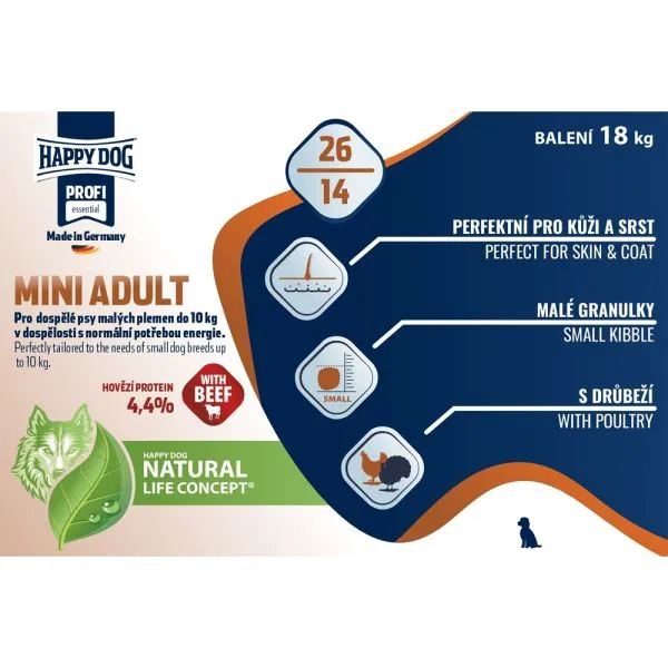 Happy Dog Profi ADULT MINI je vyvážené krmivo určené pre dospelých psov malých plemien, ktoré zabezpečuje optimálnu výživu a podporuje ich zdravý vývoj.