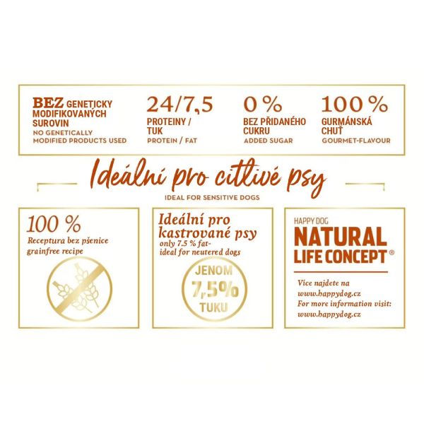 Tieto granule ponúkajú špeciálne zloženie zahŕňajúce aromatické stredomorské byliny, diétne kačacie a lososové mäso, spolu s polyfenolmi z jadierok červeného hrozna. Vďaka týmto zložkám sa Happy Dog Supreme Toscana hodí pre zdravú a šetrnú výživu veľmi citlivých psov. Znížením obsahu tuku (7,5%) a 24% proteínov je toto ľahké krmivo vynikajúce aj pre kastrované zvieratá.