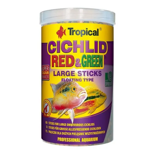 Mnohozložkové, základné krmivo vo forme plávajúcich tyčiniek pre denné kŕmenie veľkých, všežravých cichlíd. Tyčinky Cichlid Red/Green sú zároveň dokonalým doplnením diéty bylinožravých cichlíd a iných veľkých druhov rýb. Dva druhy tyčiniek zabezpečujú bohatú a pestrú diétu. Zelené tyčinky sú zdrojom cenných rias Spirulina platensis (6%), ktoré spolu s vlákninou regulujú procesy trávenia. Červené tyčinky sú zdrojom živočíšnych bielkovín a astaxantínu, ktorý intenzifikuje farby rýb. V krmive obsiahnutý prírodný imunostimulátor – beta-glukan, vitamín C a aktívne substancie spiruliny zvyšujú obranyschopnosť rýb voči chorobám. Za účelom spestrenia diéty veľkých, všežravých cichlíd doporučujeme zároveň: Cichlid-Arowana Large Sticks, Cichlid Spirulina Large Sticks.