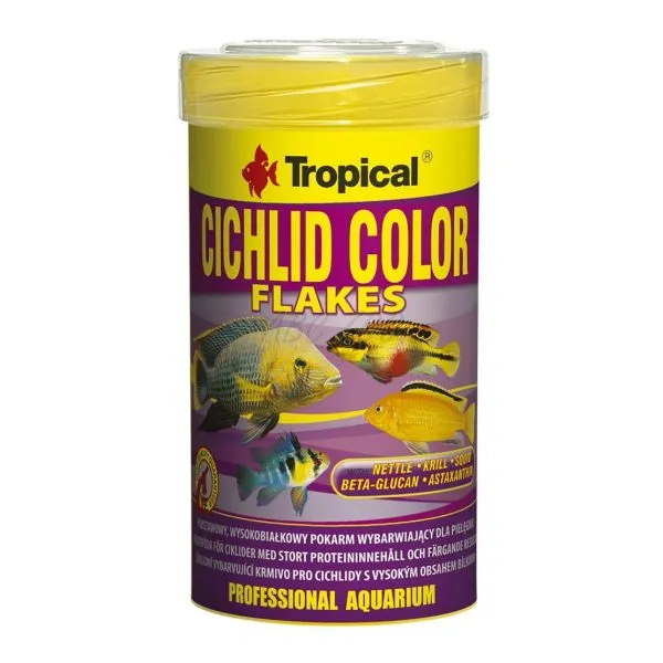 CICHLID COLOR je vyfarbujúce, vločkové krmivo s vysokým obsahom bielkovín pre denné kŕmenie všežravých a mäsožravých cichlíd, medzi nimi veľa druhov papuľovcov z jazera Malawi.