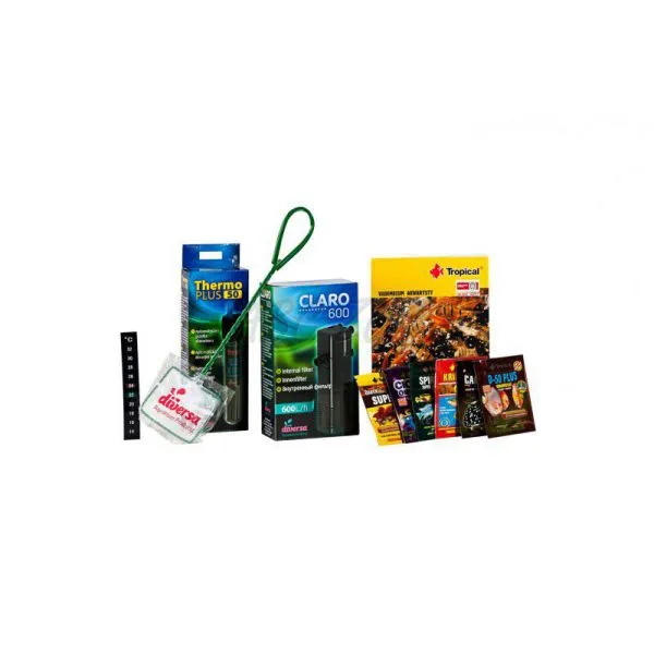 akvárium, plastový kryt s LED osvetlením, filter Claro 600, ohrievač ThermoPlus 50 W, teplomer, sieťka, 2× vzorka krmiva
