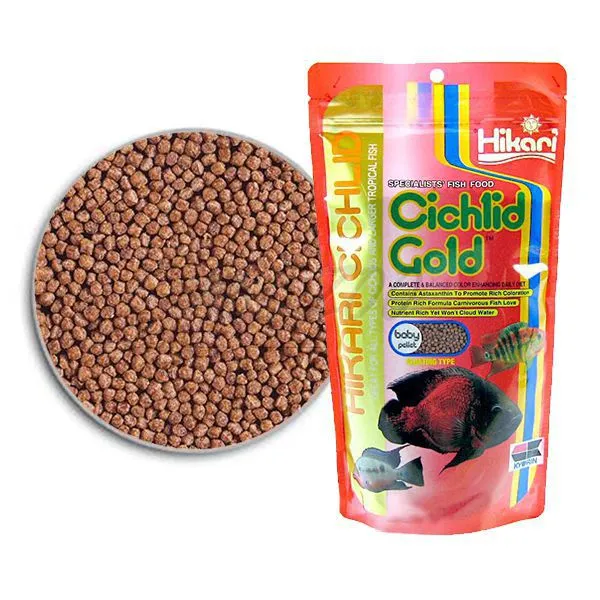 Hikari Cichlid Gold baby je krmivo určené pre cichlidy a iné veľké tropické ryby, podporuje ich vyfarbenie, prirodzenú krásu a tvar - 250 g.