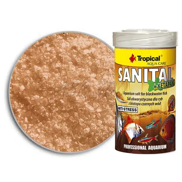 SANITAL + Ketapang je akvaristická soľ s výťažkami z listov Ketapangu (mandľovníka morského Terminalia catappa) a dubovej kôry.