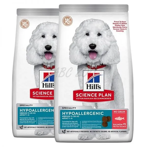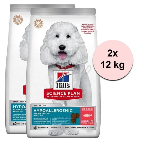 Krmivo pre dospelé psy stredných plemien Hill's Science Plan Hypoallergenic s lososom je suché krmivo s výbornou chuťou pre dospelé psy stredných plemien vo veku 1 – 6 rokov. Toto chutné hypoalergénne suché krmivo pre psy s obmedzeným množstvom vysokokvalitných nových zdrojov bielkovín a bez obsahu obilnín je prispôsobené potrebám psov s precitlivenosťou.