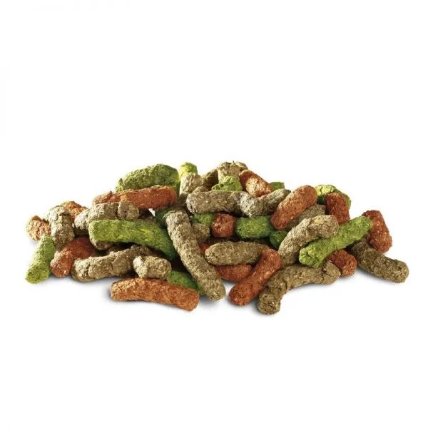 Zloženie: lucerna, bylinky (žihľava, púpava, skorocel), kukurica, sušené jablká, pšenica, mrkva, šípky, ľanové semienko, pivovarské kvasnice, Spirulina, extrakt z papriky, mannan-oligosacharidy (75 mg/kg), frukto-oligosacharidy (50 mg /kg), ostropestrec mariánsky (50 mg/kg), extrakt z Yucca schidigera (45 mg/kg).
