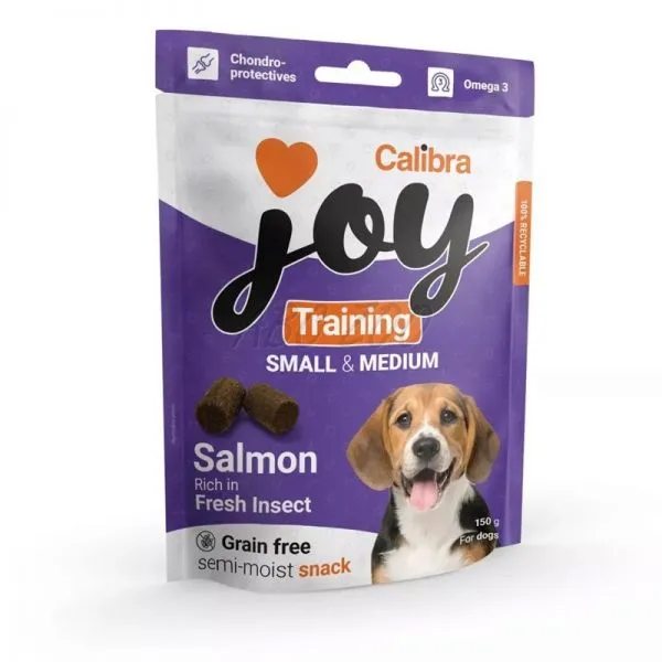 Calibra Joy Dog Training je bezobilná výcviková maškrta s lososom a čerstvým hmyzom pre dospelé psy malých a stredných plemien.