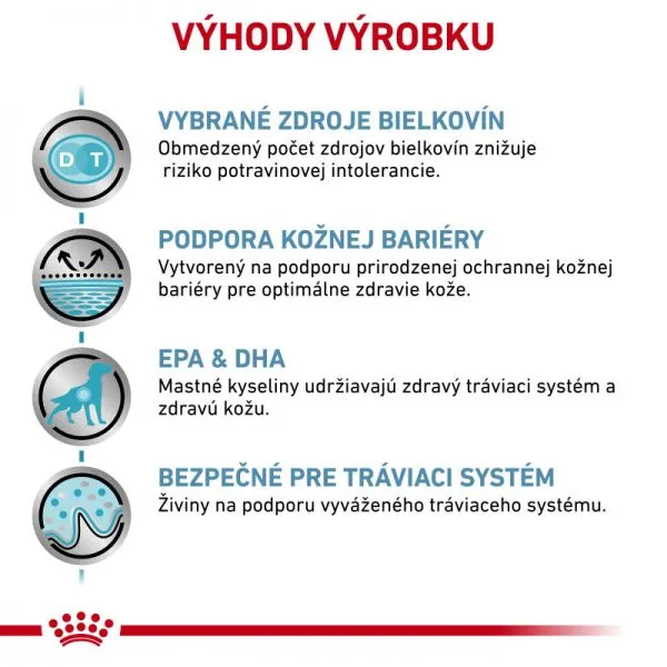 Špeciálna veterinárna diéta pre dospelé psy trpiace potravinovými intoleranciami určitých komponentov a živín.