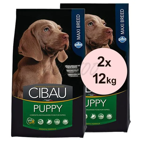 Krmivo Cibau Puppy Maxi je kompletné krmivo vhodné pre šteňatá veľkých a obrích plemien od odstavu až po dosiahnutie dospelosti. Výnimočná starostlivosť bola venovaná zabezpečeniu správneho množstva vápnika, fosforu a vitamínu D: látok esenciálnych pre vývin kostry. Obsahuje prídavok glukosamínu a chondroitín sulfátu pre zdravé kĺby. Veľkosť granuly bola pozorne skúmaná, aby umožnila jednoduchšie prežúvanie pri prijímaní potravy a podporila tak vylučovanie slín, tráviace procesy a vstrebávanie živín. Krmivo Cibau Puppy Maxi obsahuje kuracie mäso a ryby ako hlavný zdroj bielkovín, ryžu a kukuricu ako ľahko stráviteľné uhľohydráty, rybí tuk na zabezpečenie správneho množstva Omega 3 mastných kyselín, vitamíny a iné výživné látky potrebné pre správnu a vyváženú výživu. Repná dužina je zdroj bohatý na kvalitnú vlákninu, podporuje peristaltiku a spolu s ľahkou stráviteľnosťou surovín umožňuje tvorbu menšieho množstva pevnejšej stolice. Keď váš pes dosiahne dospelosť, začnite podávať krmivo Cibau Adult Maxi.