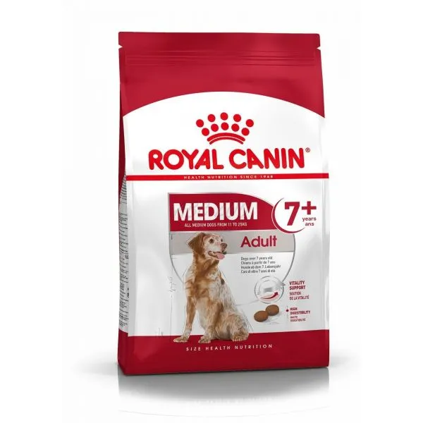 ROYAL CANIN® Medium Adult 7+ je vhodný pre stredné psy vo veku 7+, ktorí vážia medzi 11-25 kg, je špeciálne vytvorený s ohľadom na všetky nutričné ​​potreby vášho stredne veľkého dospelého psa.