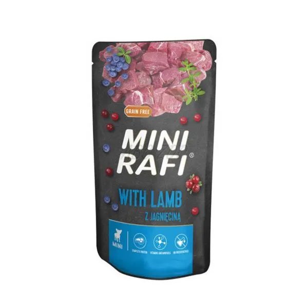 Rafi je kompletné bezobilninové mokré krmivo v kapsičke, s jahňacím mäsom, čučoriedkami a brusnicami, pre dospelé psy malých plemien.