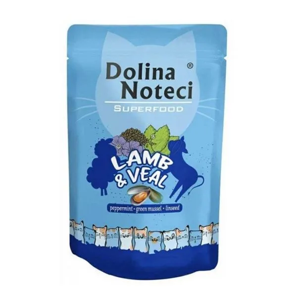 Dolina Noteci Superfood je kompletné bezobilninové mokré krmivo s jahňacím a teľacím mäsom, pre dospelé mačky všetkých plemien.