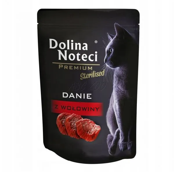 Dolina Noteci Premium je kompletné vlhké krmivo bez obilnín, s hovädzím mäsom pre dospelé sterilizované mačky všetkých plemien.