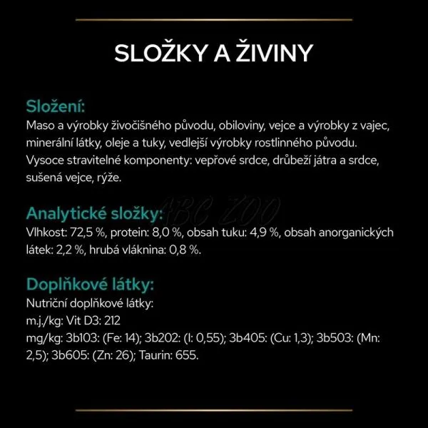 Vysoko stráviteľné zložky krmiva: Bravčové srdce, Hydinová pečeň a srdce, Sušené vajcia, Ryža