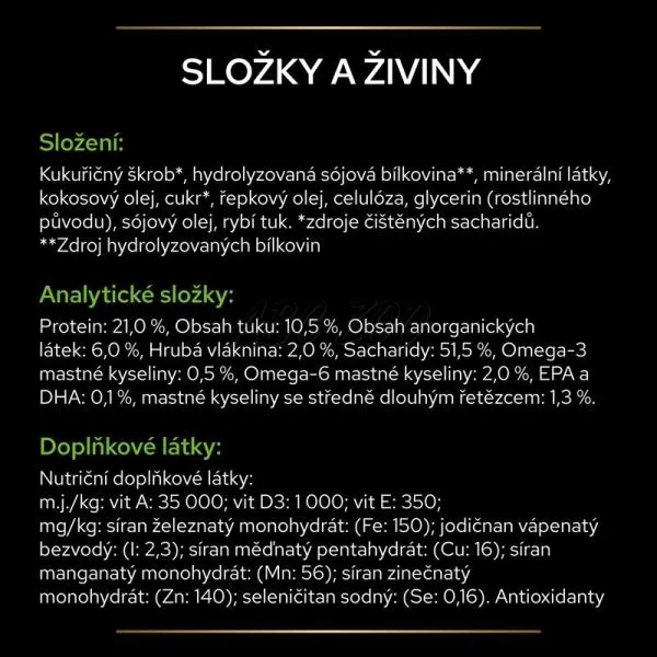 Zloženie: Kukuričný škrob*, Hydrolyzovaná sójová bielkovina**, Minerálne látky, Kokosový olej, Cukor*, Repkový olej, Celulóza, Glycerín (rastlinného pôvodu), Sójový olej, Rybí olej