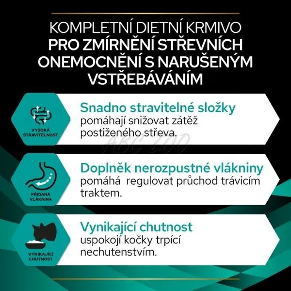 Purina Veterinary Diets je kompletné mokré diétne krmivo v kapsičkách pre dospelé mačky a mačiatka, určené na zníženie porúch črevného vstrebávania a na výživu pre zotavenie a rekonvalescenciu.