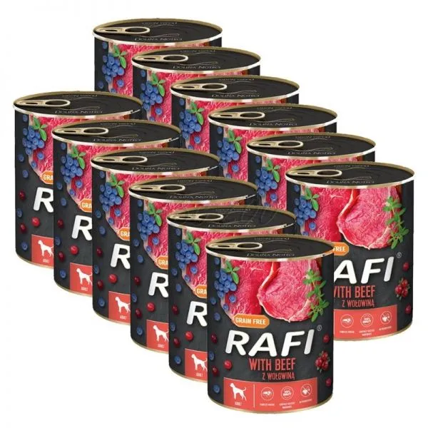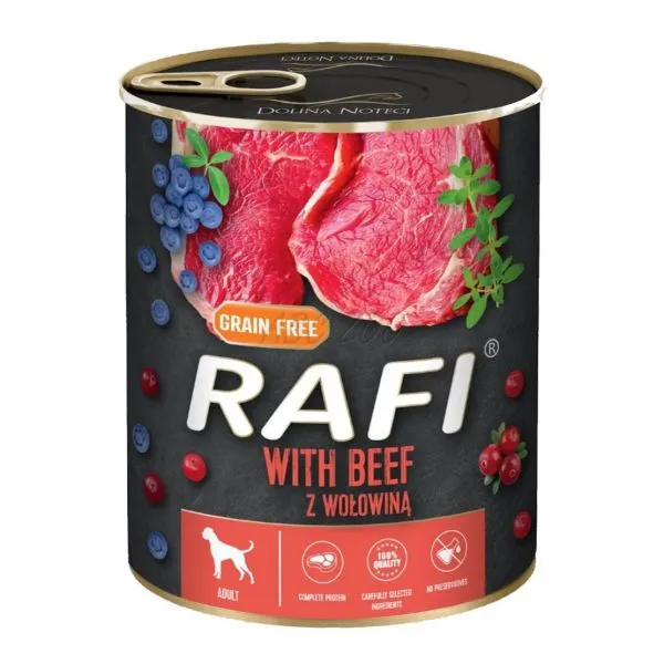 Rafi je kompletné bezobilninové mokré krmivo v konzerve, s hovädzím mäsom, čučoriedkami a brusnicami, pre dospelé psy všetkých plemien.