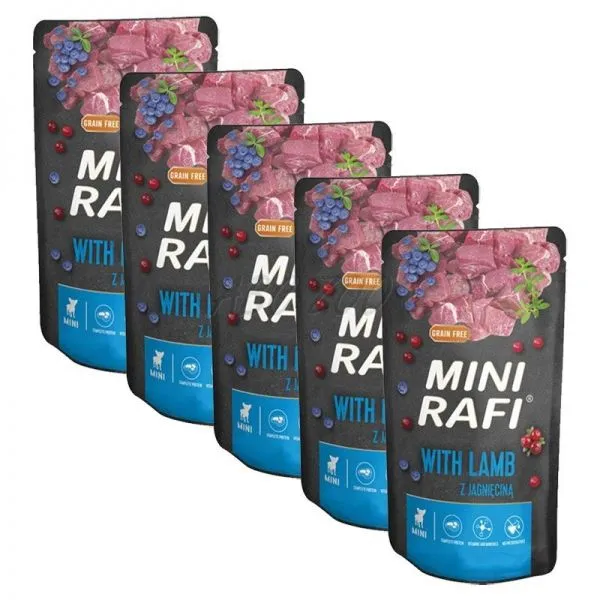 Rafi je kompletné bezobilninové mokré krmivo v kapsičke, s jahňacím mäsom, čučoriedkami a brusnicami, pre dospelé psy malých plemien.
