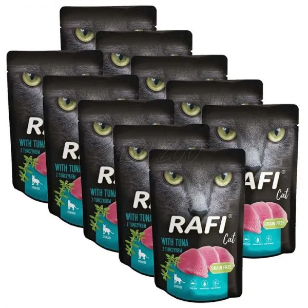 Rafi je kompletné bezobilninové mokré krmivo v kapsičke, s tuniakom, pre dospelé sterilizované mačky.