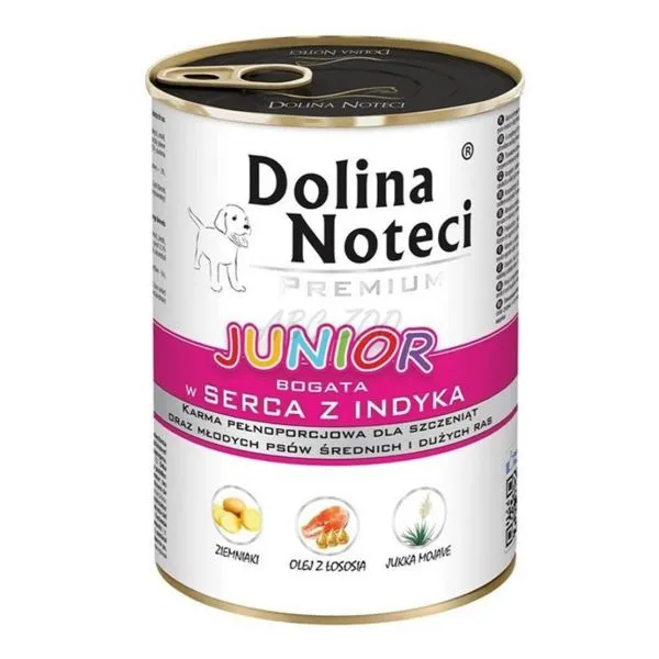 Dolina Noteci Premium Junior je kompletné vlhké krmivo bez obilnín, pre mladé psy všetkých plemien, s morčacími srdiečkami.