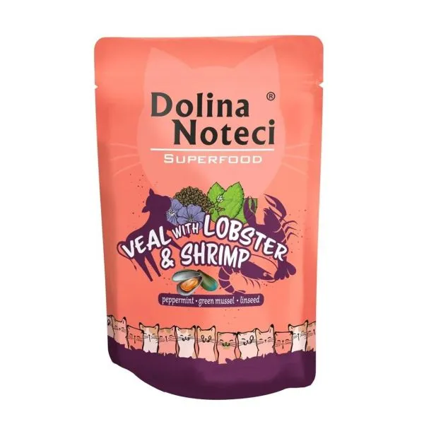 Dolina Noteci Superfood je kompletné bezobilninové mokré krmivo s teľacím mäsom, homárom a krevetami, pre dospelé mačky všetkých plemien.