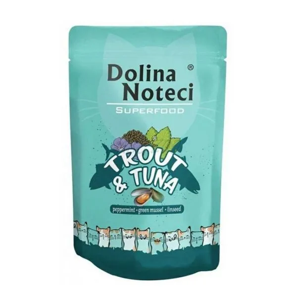 Dolina Noteci Superfood je kompletné bezobilninové mokré krmivo so pstruhom a tuniakom, pre dospelé mačky všetkých plemien.