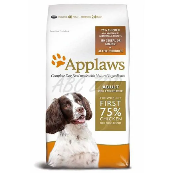 Applaws Dog Adult Small & Medium Breed Chicken je kompletné prirodzene hypoalergénne krmivo bez obsahu obilnín, určené pre dospelých psov malých a stredných plemien, obsahuje až 75 % kuracieho mäsa.