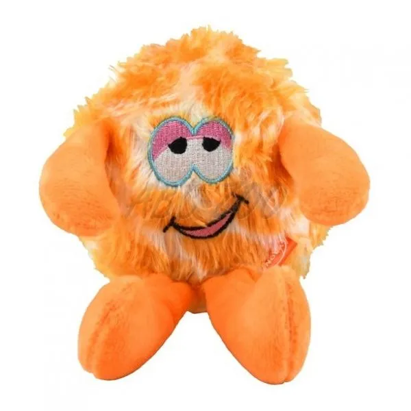 Plyšová hračka pre psy s pískatkom v tvare príšerky oranžovej farby.