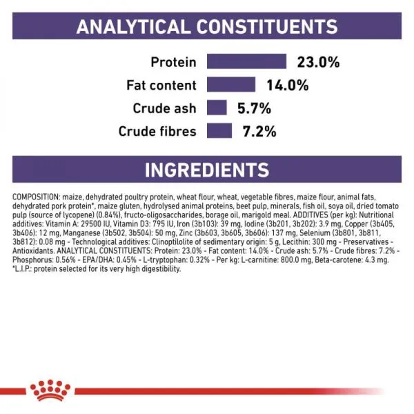 ZLOŽENIE: kukurica, dehydrované hydinové bielkoviny, pšeničná múka, pšenica, rastlinná vláknina, kukuričná múka, živočíšne tuky, dehydrované bravčové bielkoviny*, kukuričný glutén, hydrolyzované živočíšne bielkoviny, cukrovarské rezky, minerálne látky, rybí olej, sójový olej, sušená paradajková dužina (zdroj lykopénu) (0,84 %), fruktooligosacharidy, borákový olej, múčka z aksamietnic.
