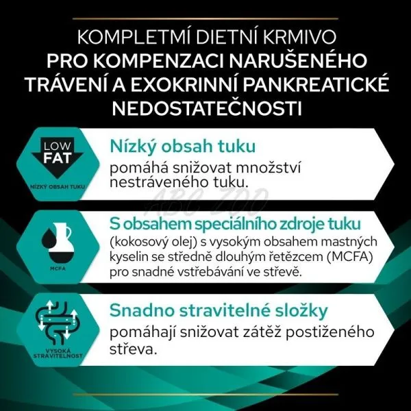 Purina Veterinary Diets je kompletné vysoko stráviteľné mokré krmivo s nízkym obsahom vlákniny pre dospelých psov, určené na kompenzáciu tráviacich porúch a exokrinnej pankreatickej nedostatočnosti.