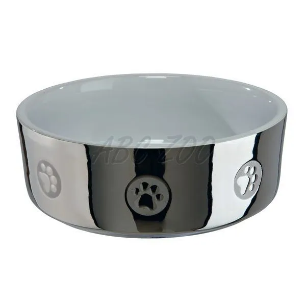 Keramická miska pre psov v striebornej farbe s motívom labiek, vnútro v bielej farbe.