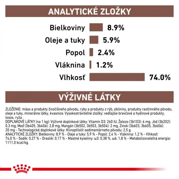 ANALYTICKÉ ZLOŽKY: Bielkoviny: 8,9 % - Oleje a tuky: 5,9 % - Popol: 2,4 % - Vláknina: 1,2 % - Vlhkosť: 74,0 % - Sodík: 0,27 % - Draslík: 0,17 % - Mastné kyseliny: ω3: 0,38 %, ω6: 1,8 % - Metabolizovateľná energia: 1111,0 kcal/kg.