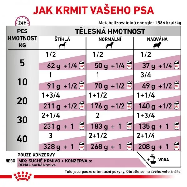 U psov s renálnou insuficienciou nie sú obličky vždy schopné účinne filtrovať fosfor z krvného obehu. Tento produkt obsahuje špecificky nízky obsah fosforu na podporu funkcie obličiek. Vďaka špeciálne upravenému obsahu energie pomáha ROYAL CANIN Renal znížiť objem každého jedla av konečnom dôsledku podporí vášho psa v prípadoch zníženej chuti do jedla. Pre ďalšiu podporu zníženej chuti do jedla alebo prípadov averzie do jedla je ROYAL CANIN® Renal formulovaný so špecifickým aromatickým profilom. Špeciálna a príťažlivá textúra tohto produktu pomáha stimulovať chuť do jedla vášho psa. Prilákať vášho psa k miske s jedlom nie je vždy ľahké v prípadoch averzie na jedenie. Aby bolo vyhovené individuálnym preferenciám každého psa, je ROYAL CANIN® Renal k dispozícii aj ako suché krmivo. Vďaka tejto rozmanitosti textúr je pre vás jednoduchšie pomáhať stimulovať a podporovať rôznu chuť do jedla vášho psa. Pokiaľ má váš pes rád zmiešanú stravu skladajúcu sa z mokrého a suchého krmiva, nezabudnite sa pozrieť na priložené príručky na kŕmenie, aby ste zaistili zdravý denný príjem potravy pre vášho psa. Veterinárne krmivá ROYAL CANIN® Renal pre psov sú zostavené tak, aby podporovali psy s chronickou renálnou insuficienciou.