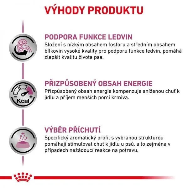 U psov s renálnou insuficienciou nie sú obličky vždy schopné účinne filtrovať fosfor z krvného obehu. Tento produkt obsahuje špecificky nízky obsah fosforu na podporu funkcie obličiek. Vďaka špeciálne upravenému obsahu energie pomáha ROYAL CANIN Renal znížiť objem každého jedla av konečnom dôsledku podporí vášho psa v prípadoch zníženej chuti do jedla. Pre ďalšiu podporu zníženej chuti do jedla alebo prípadov averzie do jedla je ROYAL CANIN® Renal formulovaný so špecifickým aromatickým profilom. Špeciálna a príťažlivá textúra tohto produktu pomáha stimulovať chuť do jedla vášho psa. Prilákať vášho psa k miske s jedlom nie je vždy ľahké v prípadoch averzie na jedenie. Aby bolo vyhovené individuálnym preferenciám každého psa, je ROYAL CANIN® Renal k dispozícii aj ako suché krmivo. Vďaka tejto rozmanitosti textúr je pre vás jednoduchšie pomáhať stimulovať a podporovať rôznu chuť do jedla vášho psa. Pokiaľ má váš pes rád zmiešanú stravu skladajúcu sa z mokrého a suchého krmiva, nezabudnite sa pozrieť na priložené príručky na kŕmenie, aby ste zaistili zdravý denný príjem potravy pre vášho psa. Veterinárne krmivá ROYAL CANIN® Renal pre psov sú zostavené tak, aby podporovali psy s chronickou renálnou insuficienciou.