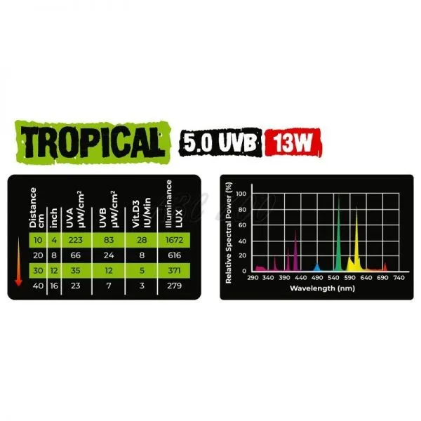 UVB 5.0 spektrum vhodné pre živočíšne druhy s priemernou náročnosťou na UV žiarenie, ktoré sa prirodzene vyskytujú v tropických oblastiach - tropické pralesy, oblasti chránené pred priamym slnečným žiarením. UVB spôsobuje efektívnu syntézu vitamínu D3, pričom podporuje vstrebávanie vápnika a je prevenciou metabolických ochorení. Žiarivka tiež vyžaruje UVA žiarenie, ktoré stimuluje chuť do jedla a reprodukčné správanie.