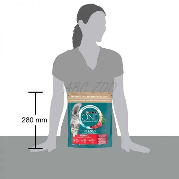 Purina ONE Sterilcat je kompletné krmivo s hovädzím mäsom pre dospelé kastrované / sterilizované mačky.