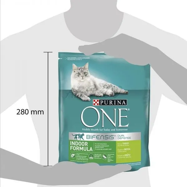 Purina ONE Indoor je špeciálne prispôsobené krmivo s morčacím mäsom pre dospelé mačky žijúce v byte.