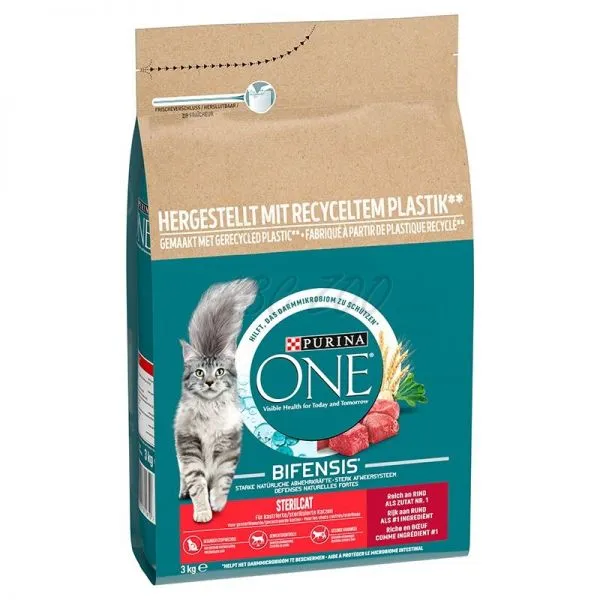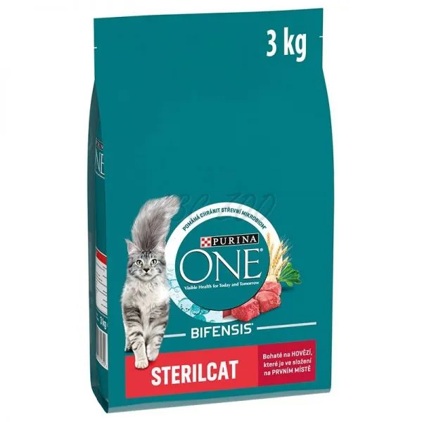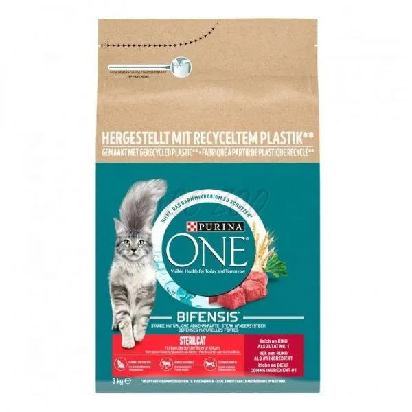 Purina ONE Sterilcat je kompletné krmivo s hovädzím mäsom pre dospelé kastrované/sterilizované mačky.