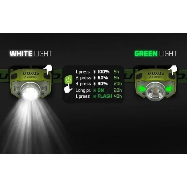 Čelovka disponuje výkonom 5 W a svietivosťou až 300 lm. Vďaka týmto parametrom a  možnosti fokusovania svetelného lúča tak nebude problém dostatočne osvetliť vaše bezprostredné okolie, ale aj vzdialené ciele. OXUS ZOOM je vybavená pohybovým senzorom, čím ju poľahky zapnete a vypnete mávnutím ruky.