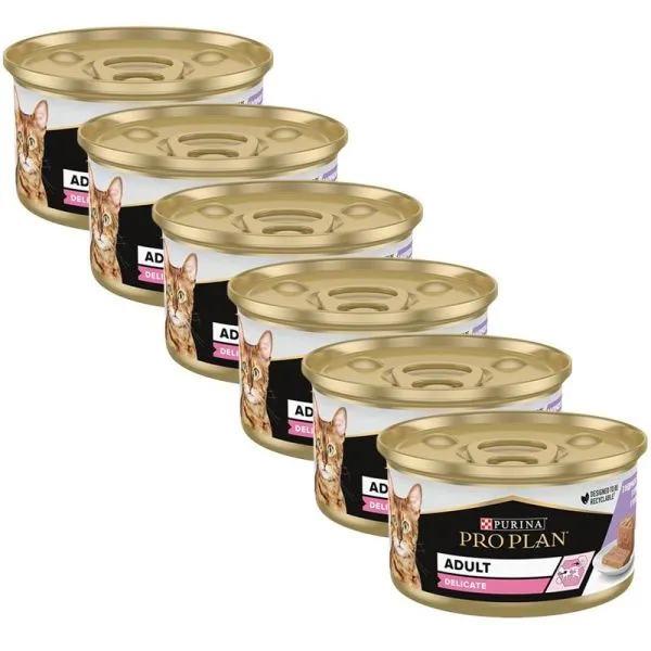 Firma Pro Plan ponúka vysoko nutričné krmivo pre dospelé mačky. Krmivo je balené v klasických konzervách, ktoré sú ľahko skladovateľné a jednoducho sa podávajú. Konzerva pre mačky Pro Plan cat delicate morčacie kúsky v paštéte 24× 85 g poslúži pre akékoľvek plemeno. Táto konzerva je vyvinutá predovšetkým pre maznáčikov s bežnou aktivitou. Jej morčacia receptúra sa stane populárnou dobrôtkou vášho štvornohého maznáčika. Celkovo 7,5 % obsahu tvorí tuk. Konzerva pre mačky je pripravená do mokrej konzistencie a balenie váži 0,096 kg.