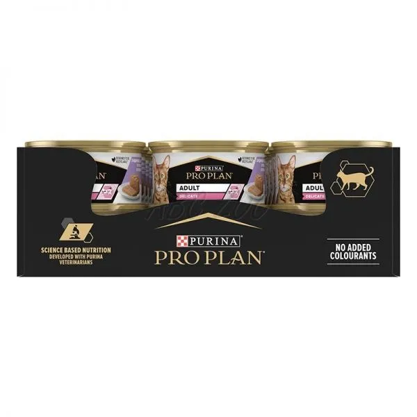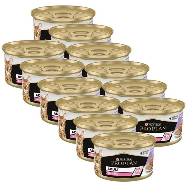 Firma Pro Plan ponúka vysoko nutričné krmivo pre dospelé mačky. Krmivo je balené v klasických konzervách, ktoré sú ľahko skladovateľné a jednoducho sa podávajú. Konzerva pre mačky Pro Plan cat delicate morčacie kúsky v paštéte 24× 85 g poslúži pre akékoľvek plemeno. Táto konzerva je vyvinutá predovšetkým pre maznáčikov s bežnou aktivitou. Jej morčacia receptúra sa stane populárnou dobrôtkou vášho štvornohého maznáčika. Celkovo 7,5 % obsahu tvorí tuk. Konzerva pre mačky je pripravená do mokrej konzistencie a balenie váži 0,096 kg.