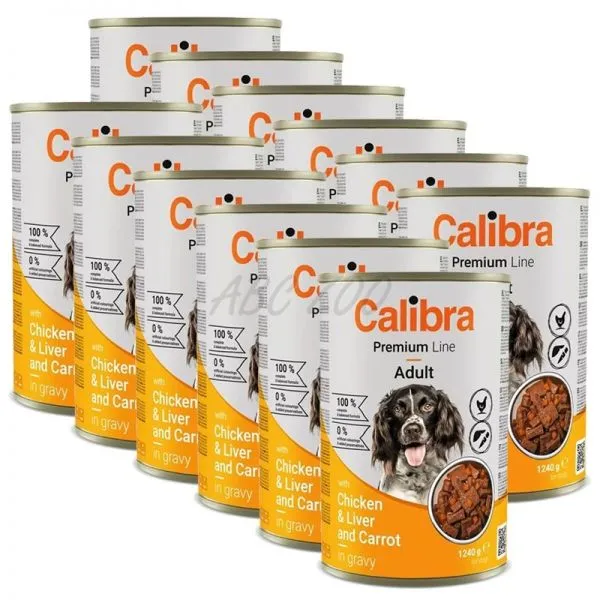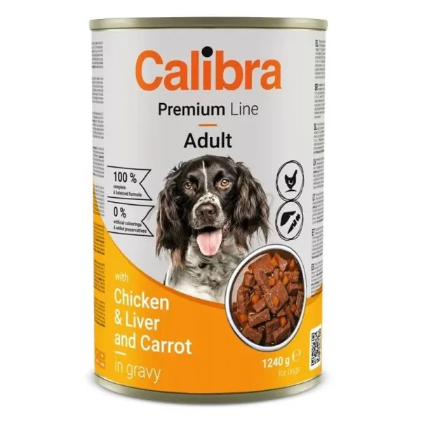 Calibra Dog Premium s kuracím, pečeňou a mrkvou v omáčke je mäsová konzerva s kompletnou a vyváženou receptúrou pre dospelé psy.