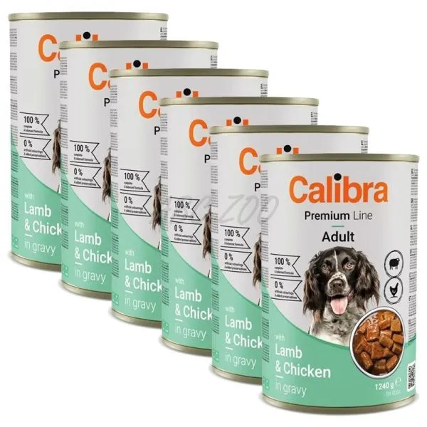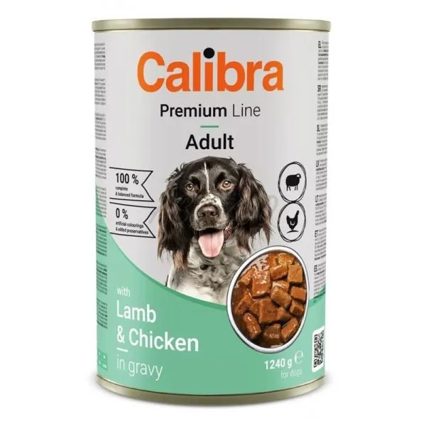Calibra Dog Premium s jahňacím a kuracím v omáčke je mäsová konzerva s kompletnou a vyváženou receptúrou pre dospelé psy.