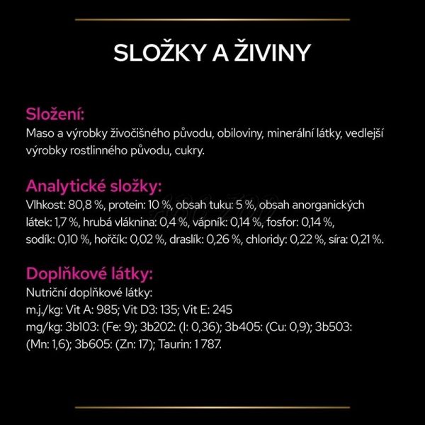 Zloženie: Mäso a vedľajšie produkty živočíšneho pôvodu, Minerálne látky, Obilniny, Vedľajšie produkty rastlinného pôvodu, Cukry