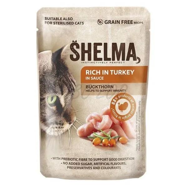 Shelma kapsička je kompletné krmivo bez obilnín pre dospelé mačky, bohaté na morčacie mäso s rakytníkom.