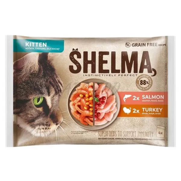 Shelma kapsička je kompletné krmivo bez obilnín pre mačiatka, bohaté na lososa s rakytníkom a morčacie mäso s brusnicou.