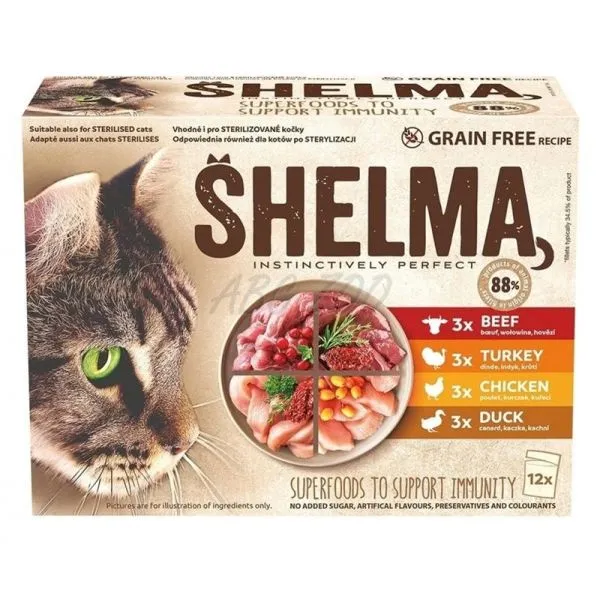 Shelma kapsička je kompletné krmivo bez obilnín pre dospelé mačky, bohaté na kuracie, hovädzie, morčacie a kačacie mäso.