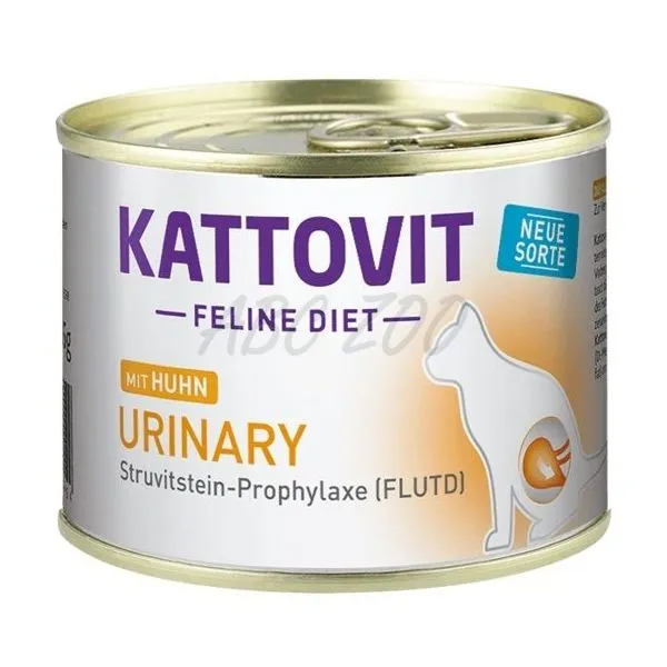 Kattovit Urinary konzerva je určená pre mačky s FLUTD (Feline Lower Urinary Tract Disease) problémami s dolnými močovými cestami a na zníženie výskytu struvitových kameňov – s príchuťou kuracieho mäsa.